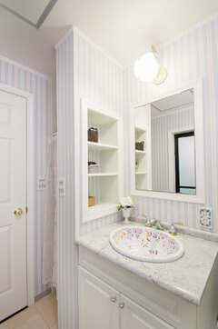 洗面所の壁クロスはストライプで高さを強調しています 280 Style インテリアコーディネート